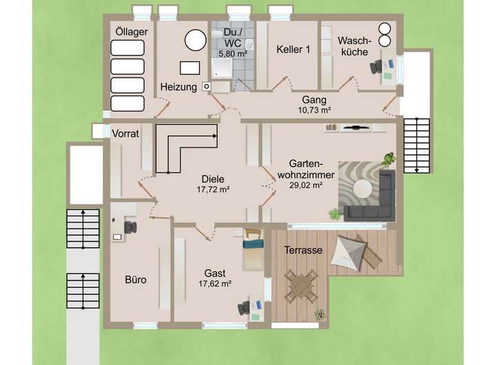 Im Gartengeschoss lädt ein großes Gartenwohnzimmer mit Zugang zur schönen Terrasse ein.