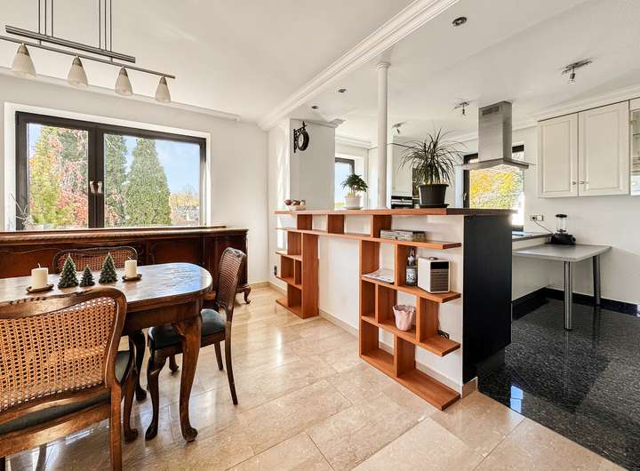 Angrenzend befindet sich das Esszimmer mit offener Einbauküche.