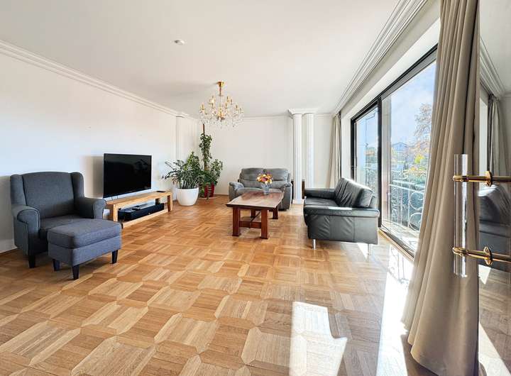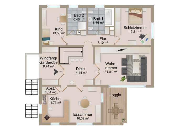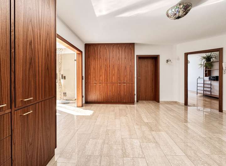 Bereits der großzügige Eingangsbereich beeindruckt mit integrierter Garderobe und dem Gäste-WC. Das lichtdurchflutete Wohnzimmer mit Zugang zur Loggia bietet einen herrlichen Ausblick ins Grüne.