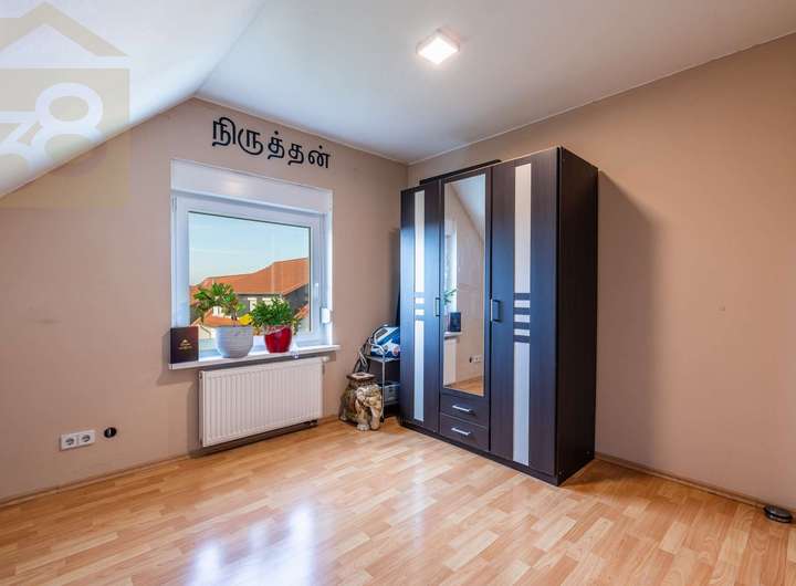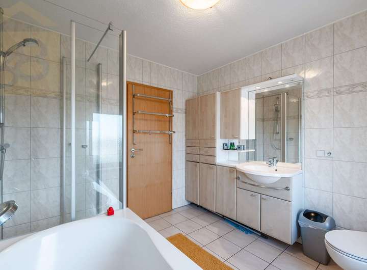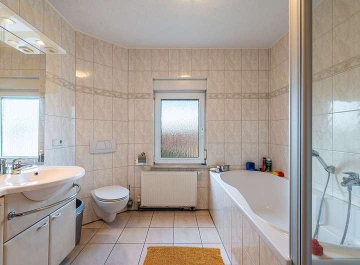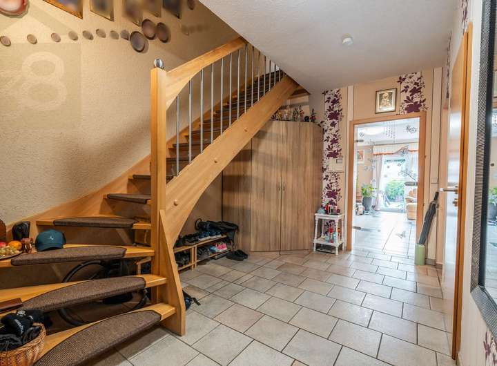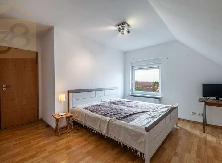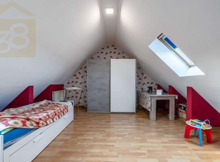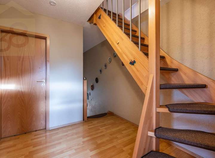 Eine offene Holztreppe führt in das Obergeschoss. Dort befindet sich ein großes Badezimmer mit Wanne und Dusche sowie drei weitere Zimmer, die sich flexibel als Kinder-, Gäste- oder Arbeitszimmer nutzen lassen. Im ausgebauten Dachgeschoss steht ein weiterer heller Wohnraum zur Verfügung, der sich hervorragend als Arbeits- oder Gästezimmer eignet und den Wohnkomfort des Hauses abrundet.