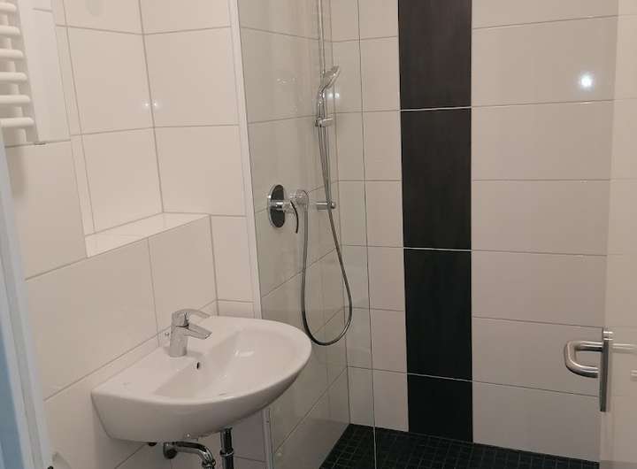 Das Badezimmer verfügt über eine bodentiefe, barrierefreie Dusche.