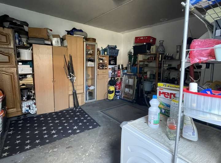 Eine geräumige Garage ist mit einem hohen Zufahrtstor ausgestattet und bietet somit Platz für große Fahrzeuge, wie beispielsweise Wohnmobile.