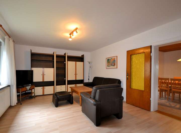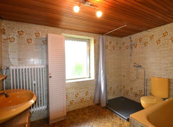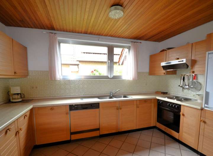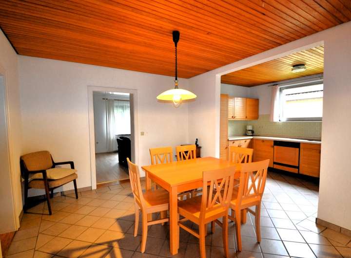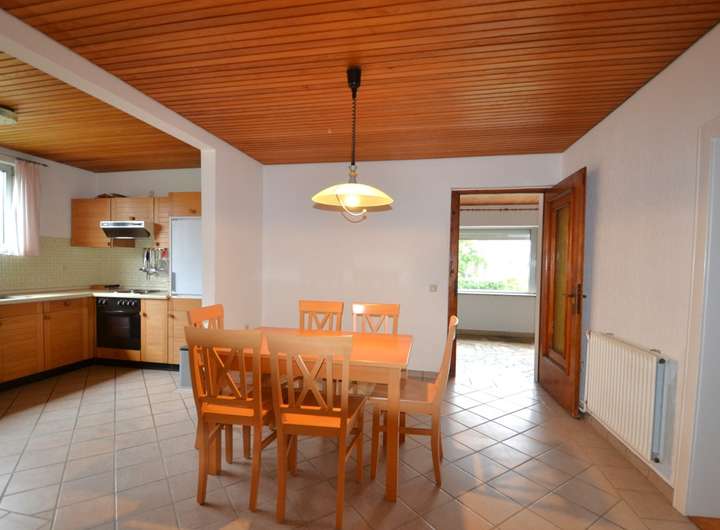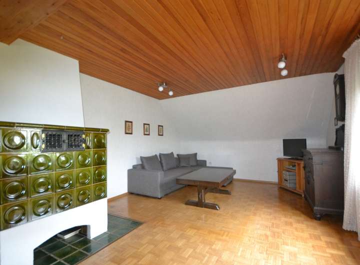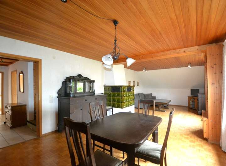 Auf dieser Ebene finden Sie ein WC, eine zusätzliche Küche, ein Schlafzimmer und einen großzügigen Raum, der als weiterer Ess- und Wohnbereich geeignet ist. Der vorhandene Kachelofen sorgt an kälteren Tagen für eine angenehem Wohnatmosphäre.