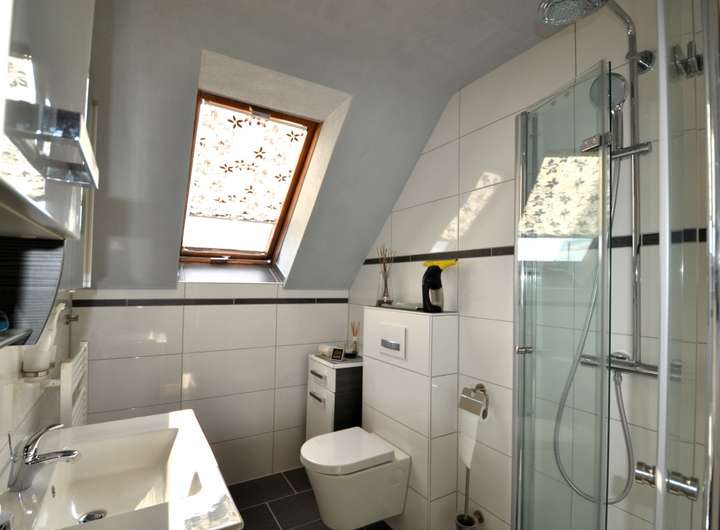 Über eine stilvolle Holztreppe erreichen Sie das Dachgeschoss, hier finden Sie das Badezimmer mit sowie zwei Schlafräume vor. Das Badezimmer ist modern gestaltet und mit einer Dusche ausgestattet, der Regenduschkopf sorgt für ein bisschen Wellness-Feeling.