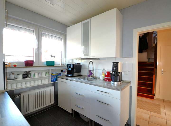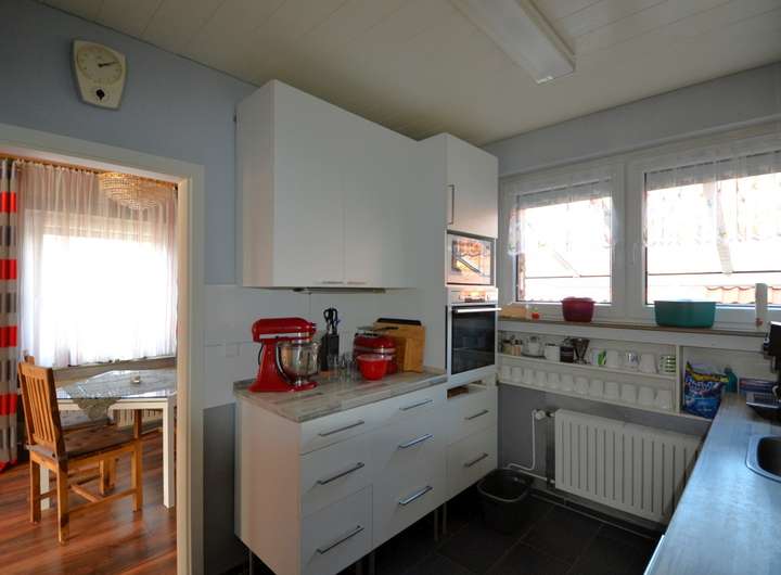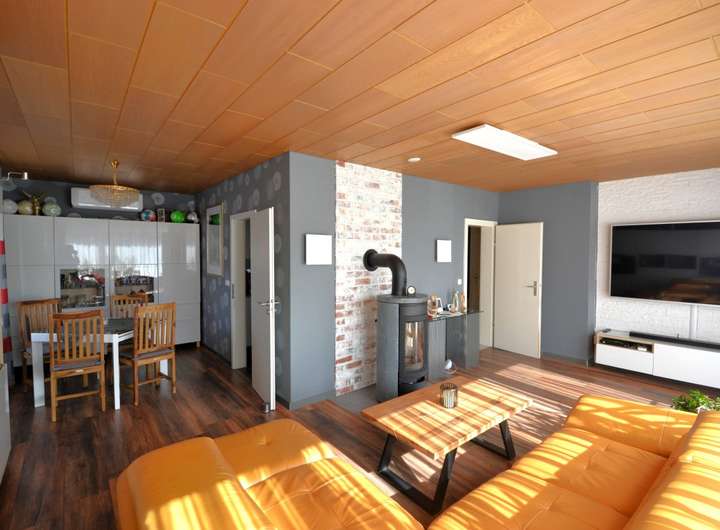 Über den Flur und die Küche, die mit einer neuwertigen Einbauküche ausgestattet ist, gelangen Sie in den großzügigen, lichtdurchfluteten Ess- und Wohnbereich. In diesem Bereich haben Sie viel Raum für das tägliche Familienleben. Der vorhandene Kamin sorgt an kälteren Tagen für eine angenehme Wohnatmosphäre.