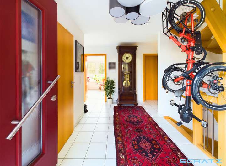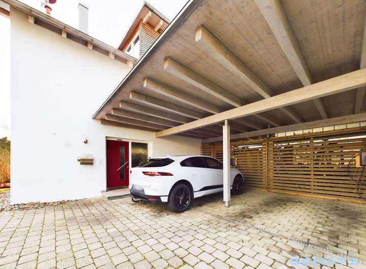 Auch in puncto Alltagstauglichkeit überzeugt das Haus: Ein Carport mit E-Ladestation, zusätzlicher Gäste-Stellplatz, praktischer Abstellbereich für Garten- und Freizeitgeräte sowie ein moderner Glasfaseranschluss garantieren höchsten Komfort. Hochwertig abschließbare Fenster sorgen zusätzlich für ein hohes Maß an Sicherheit.