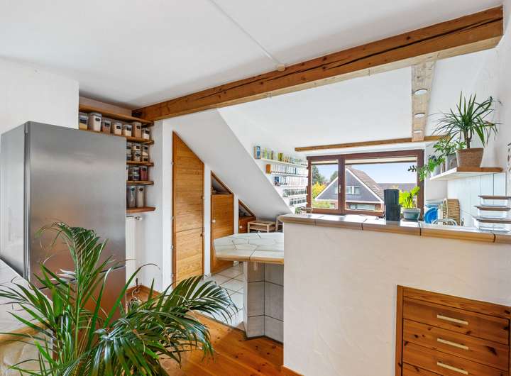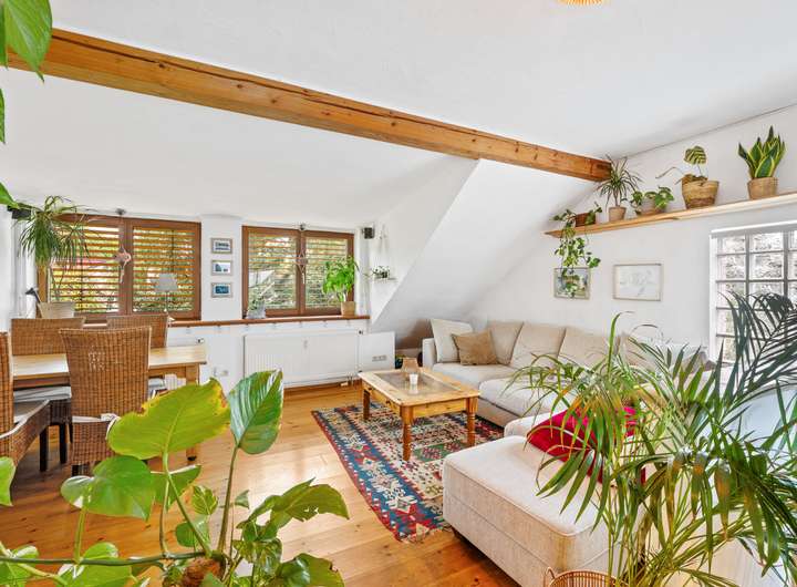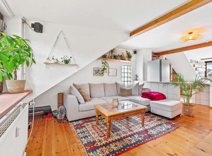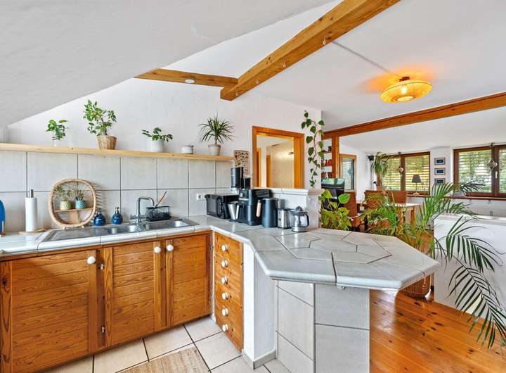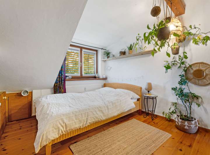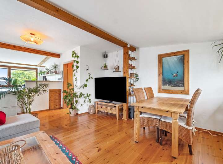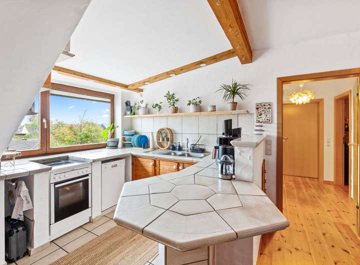 Die Dachgeschosswohnung besteht aus zwei Zimmern und verfügt über eine Wohnfläche von ca. 50 m². Beim Betreten liegt rechter Hand das Badezimmer mit einem Fenster, einem WC, einer Dusche und einem Waschbecken. Linker Hand gelangt man in das Schlafzimmer, das durch die Dachschrägen eine besonders gemütliche Atmosphäre erhält. Geradeaus öffnet sich der Wohnbereich mit einer offenen Küche. Durch den kombinierten Wohn- und Kochbereich entsteht ein offenes Raumgefühl, das dieser Wohnung einen modernen und luftigen Charakter verleiht. Sie ist seit Juli 2023 vermietet, die monatliche Kaltmiete beträgt 420,00 Euro, die Nebenkosten liegen bei 180,00 Euro.