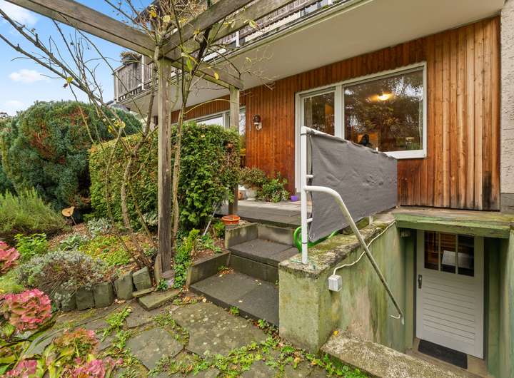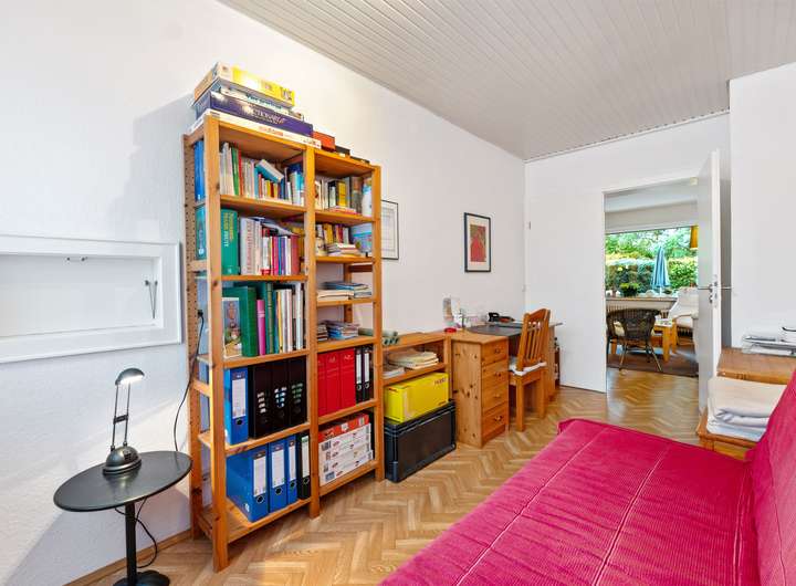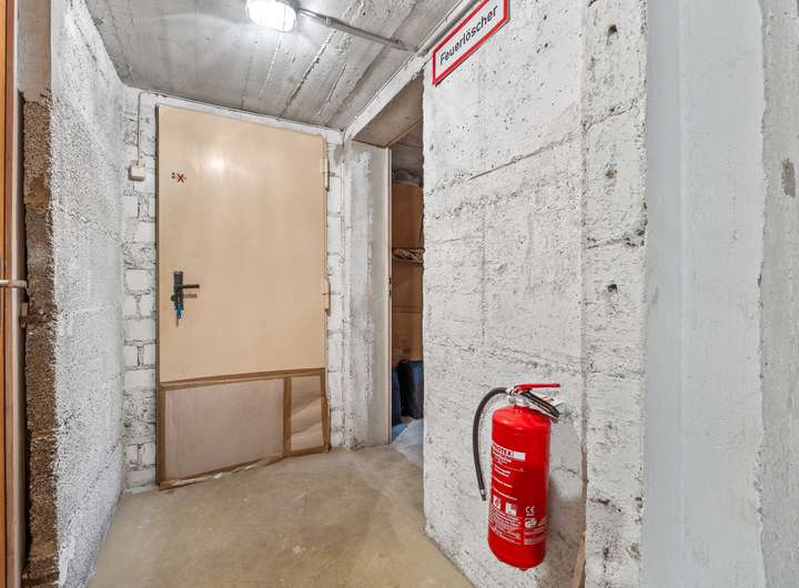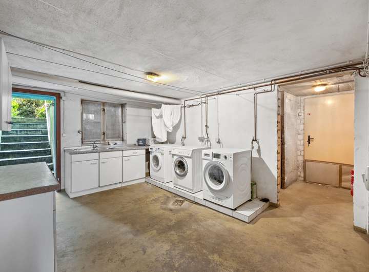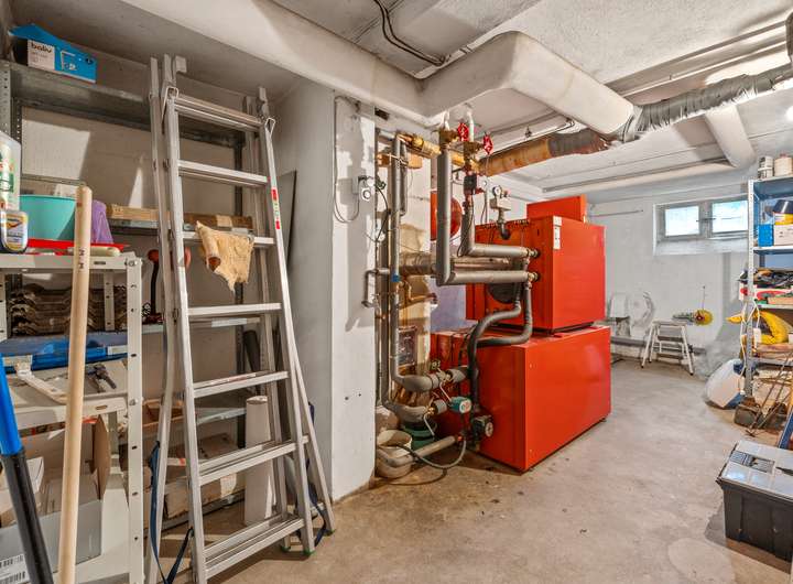 Im Kellergeschoss des Hauses befinden sich mehrere Räume. Es gibt einen gemeinschaftlichen Wasch- und Trockenraum, der allen Bewohnern zur Verfügung steht. Von hier aus gelangt man auch in den gemeinschaftlich genutzten Garten, der im Sommer zum Verweilen oder Gärtnern einlädt. Rechter Hand befinden sich die einzelnen Kellerräume der Wohnungen, die jeweils zusätzlichen Stauraum bieten. Geradeaus liegt der Heizungsraum mit der Ölzentralheizung aus dem Jahr 1998.