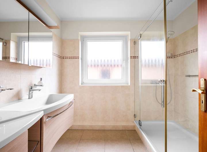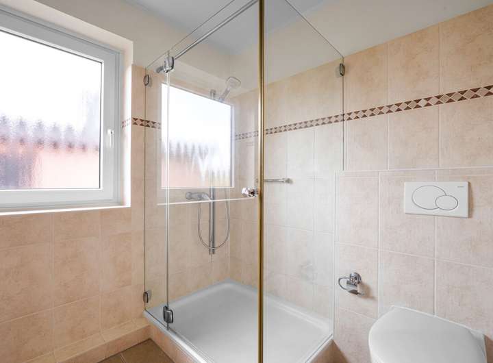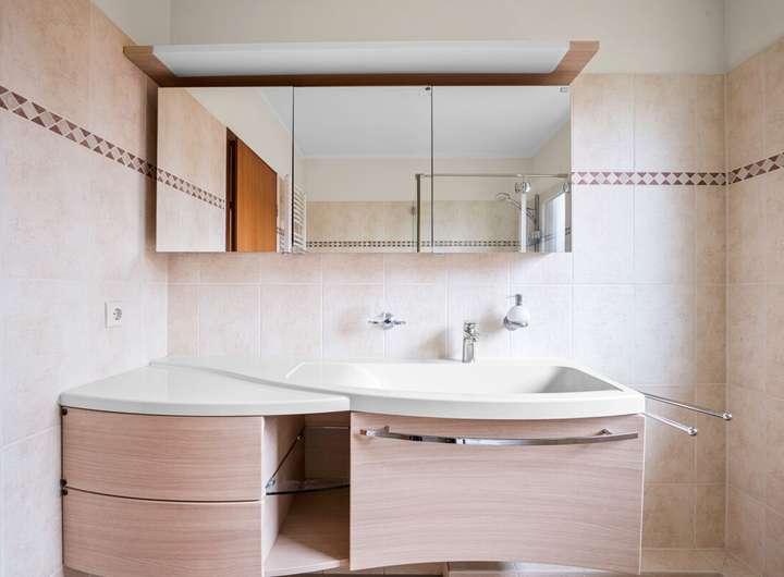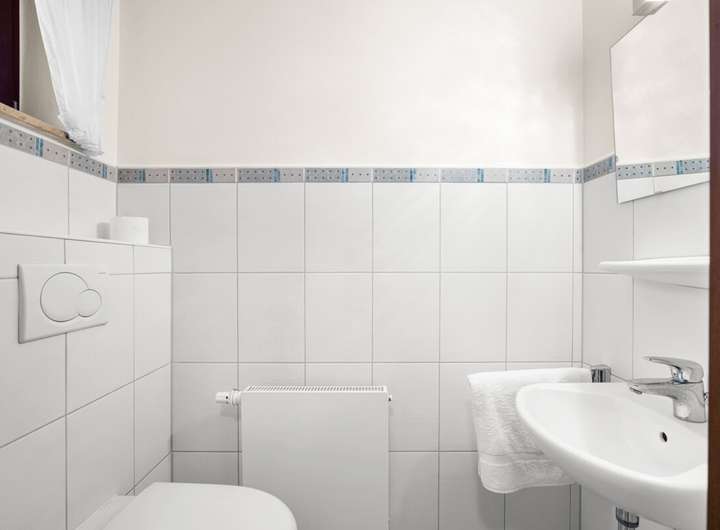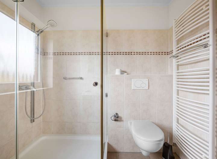 Über eine Echtholztreppe erreichen Sie das Obergeschoss. Hier erwartet Sie ein modernes Duschbad mit sandfarbenen Wandfliesen, einem hellen Bodenbelag, einem großzügigen Waschtisch, einer Handtuchheizung sowie einer ebenerdigen, übergroßen Glasduschkabine.