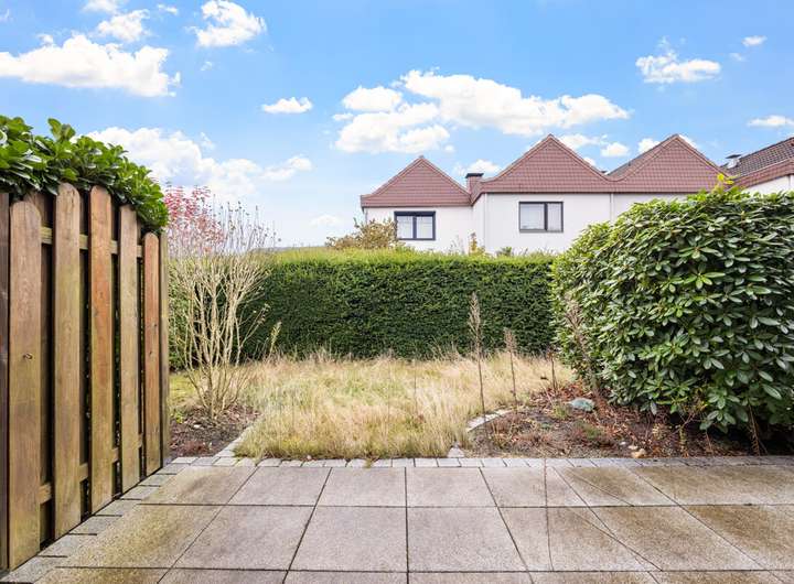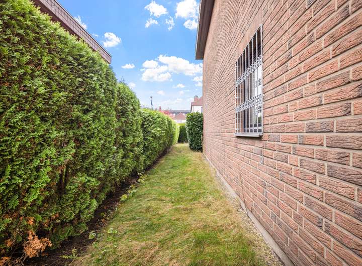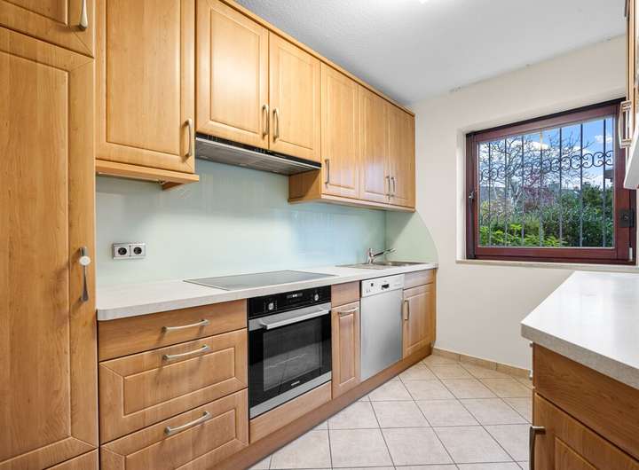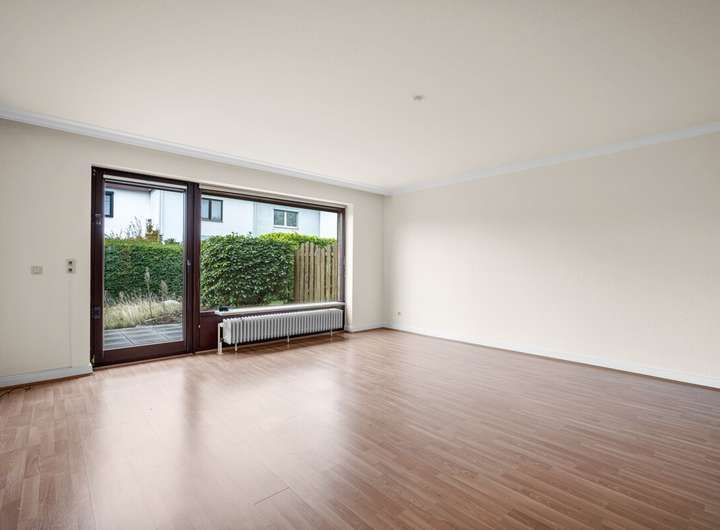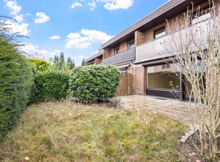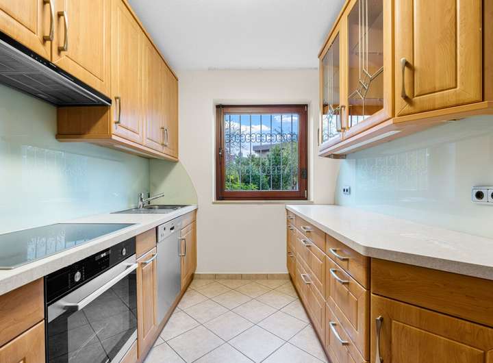 Die Küche, ca. aus dem Jahr 2010, ist hochwertig ausgestattet – unter anderem mit Markengeräten, einem Außenabzug sowie einem großzügigen Fenster, das für viel Helligkeit sorgt. Das lichtdurchflutete Wohnzimmer bietet einen schönen Blick in Ihren Garten. Von hier aus gelangen Sie auf die ca. 15 m² große Terrasse mit hellen Plattenbelägen. Immergrüne Sträucher wie Eibe und Kirschlorbeer und schöne Vollholz-Trennwände rahmen den Garten geschmackvoll ein. Ihre Oase zum Wohlfühlen!