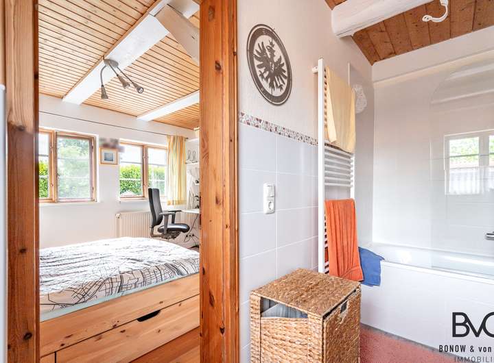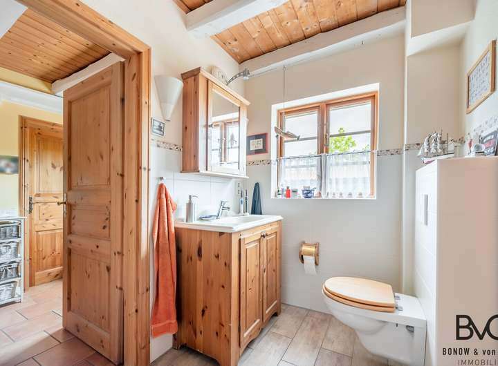 Stilvoll ergänzt wird das Erdgeschoss durch den gemütlichen Landhauscharakter mit massiven Holzdeckenbalken, Sprossenfenstern und Holzinnentüren. Eine teilweise verbaute Fußbodenheizung sorgt für zusätzlichen Wohnkomfort.