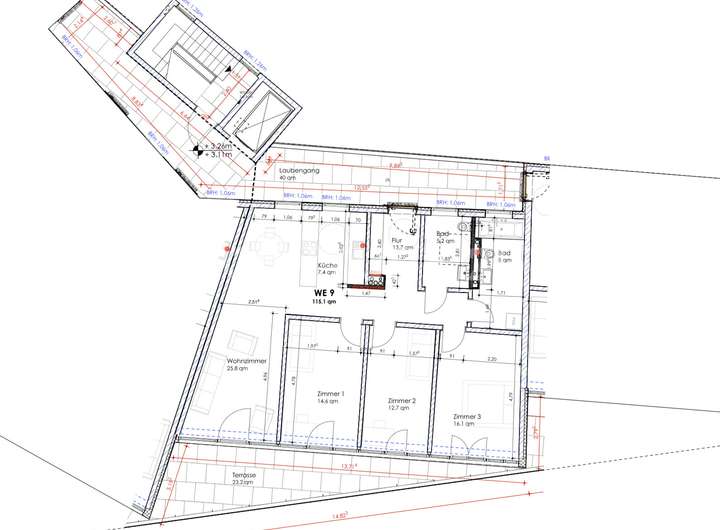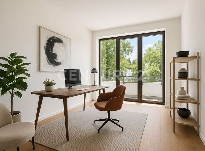 Der offene Wohnbereich mit moderner Einbauküche bildet das Herzstück der Wohnung und überzeugt durch Großzügigkeit und Helligkeit. Drei ruhige Schlafzimmer bieten flexible Nutzungsmöglichkeiten als Schlaf-, Kinder-, Arbeits- oder Gästezimmer und ermöglichen eine individuelle Gestaltung nach persönlichen Bedürfnissen. Zwei stilvolle Bäder sowie ein zentraler Flur sorgen für Komfort und eine optimale Organisation des Alltags.