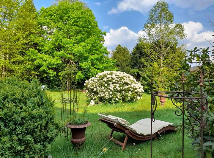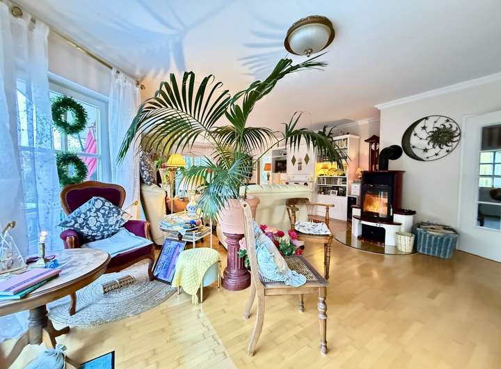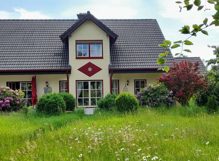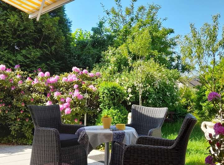 Im Außenbereich lädt der liebevoll angelegte Naturgarten mit seiner Pflanzenvielfalt zum Verweilen ein. Die große Terrasse bietet reichlich Platz für gemeinsame Stunden mit Familie und Freunden und ist gleichzeitig ein ruhiger Rückzugsort im Grünen.