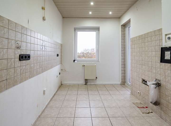 Das Badezimmer wurde modernisiert und verfügt über eine fast bodengleiche Dusche mit Regenduschsystem und Massagedüsen. Der Grundriss der Küche ist kompakt und praktisch gestaltet, hier schließt sich eine weitere kleine Loggia an, mit Blick. Zusätzlich besteht die Option zum Anschluss eines Kaminofens, was perspektivisch zusätzliche Wohnqualität schaffen kann.