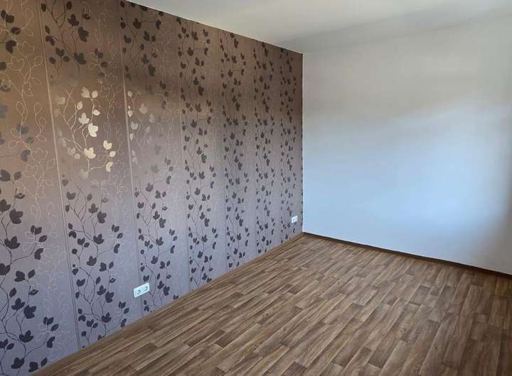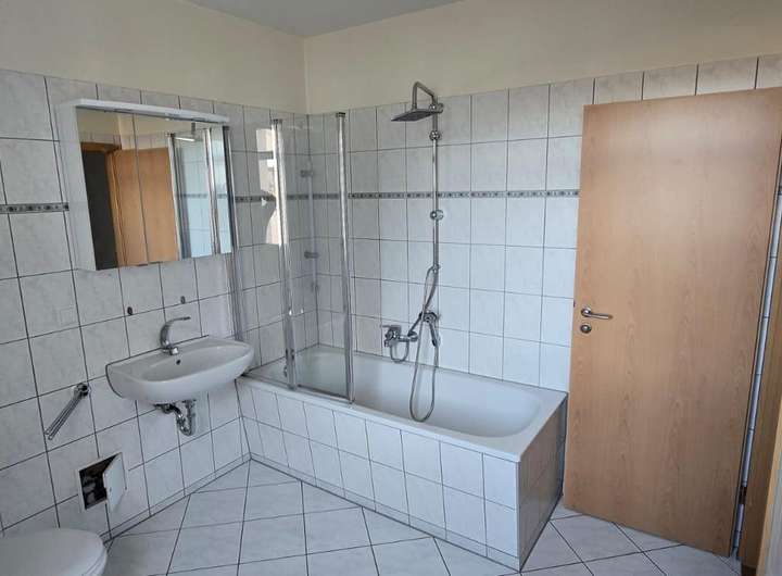 Bodenbeläge komplett in Laminat, außer Bad (Fliesen), Bad mit Wanne und mit separaten Duschabtrennung, Wandbeläge komplett mit Tapete, im Wohnzimmer und Schlafzimmer farbige Tapete, Einbauküche mit allen Geräten inkl.