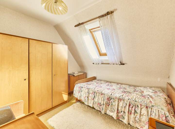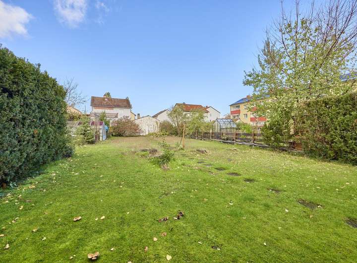 Das vordere Haus aus dem Baujahr 1958, verfügt über eine Wohnfläche von etwa 78 m² und überzeugt durch seine praktische Raumaufteilung und funktionale Gestaltung. Der Hauseingang liegt leicht erhöht in der Hochparterre. Auf dieser Ebene befinden sich ein helles Wohnzimmer, eine Küche mit Platz für einen kleinen Essbereich, ein Badezimmer mit Badewanne sowie ein separates WC. Im Obergeschoss befinden sich zwei Schlafzimmer, die einen idealen Rückzugsort zum Entspannen bieten. Das Haus ist voll unterkellert und bietet reichlich Stauraum. Zusätzlich gibt es einen separaten Abstellraum für Gartengeräte.