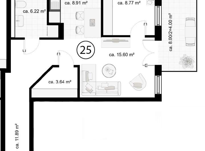 Angeboten werden hier zwei baugleiche (Nummer 25 & 28), barrierefreie 2-Zimmer-Wohnungen im Erdgeschoss. Jede Wohnung verfügt über einen hellen Wohn- und Essbereich mit offener Küche und Zugang zu einer großzügigen Terrasse mit eigenem Garten, ein gemütliches Schlafzimmer, ein modernes Tageslichtbad mit bodenebener Dusche und Waschmaschinenanschluss sowie einen praktischen Abstellraum. In die Wohnfläche sind 5,1 m² anteilig aus den gemeinschaftlich nutzbaren Flächen eingerechnet. Diese bieten zahlreiche Möglichkeiten für Begegnung und Aktivität. Ein großer Aufenthaltsraum (65m²) mit Teeküche und Außenterrasse lädt zum geselligen Beisammensein oder zum Empfang von Besuch ein. Für Bewegung steht ein Sportraum zur Verfügung, zusätzlich gibt es einen Raum für Physiotherapie oder diverse Pflegeanwendungen.