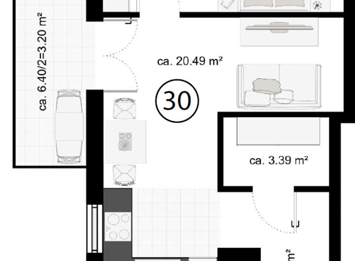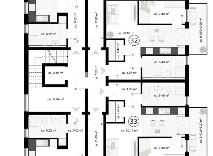 Angeboten werden hier zwei baugleiche (Nummer 30 & 35), barrierefreie 2-Zimmer-Wohnungen im 1. Obergeschoss. Jede Wohnung verfügt über einen hellen Wohn- und Essbereich mit offener Küche und Zugang zu einem großzügigen Balkon, ein gemütliches Schlafzimmer, ein modernes Tageslichtbad mit bodenebener Dusche und Waschmaschinenanschluss sowie einen praktischen Abstellraum. In die Wohnfläche sind 5,1 m² anteilig aus den gemeinschaftlich nutzbaren Flächen eingerechnet. Diese bieten zahlreiche Möglichkeiten für Begegnung und Aktivität. Ein großer Aufenthaltsraum (65m²) mit Teeküche und Außenterrasse lädt zum geselligen Beisammensein oder zum Empfang von Besuch ein. Für Bewegung steht ein Sportraum zur Verfügung, zusätzlich gibt es einen Raum für Physiotherapie oder diverse Pflegeanwendungen.