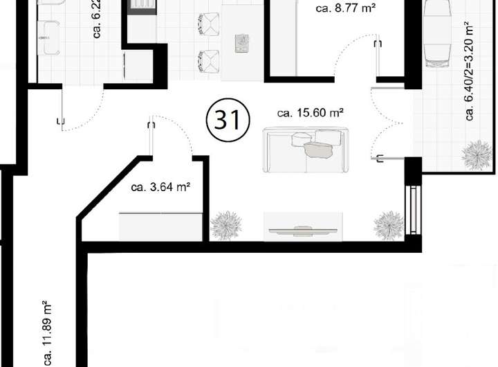 Angeboten werden hier zwei baugleiche (Nummer 31 & 34), barrierefreie 2-Zimmer-Wohnungen im 1. Obergeschoss. Jede Wohnung verfügt über einen hellen Wohn- und Essbereich mit offener Küche und Zugang zu einem großzügigen Balkon, ein gemütliches Schlafzimmer, ein modernes Tageslichtbad mit bodenebener Dusche und Waschmaschinenanschluss sowie einen praktischen Abstellraum. In die Wohnfläche sind 5,1 m² anteilig aus den gemeinschaftlich nutzbaren Flächen eingerechnet. Diese bieten zahlreiche Möglichkeiten für Begegnung und Aktivität. Ein großer Aufenthaltsraum (65m²) mit Teeküche und Außenterrasse lädt zum geselligen Beisammensein oder zum Empfang von Besuch ein. Für Bewegung steht ein Sportraum zur Verfügung, zusätzlich gibt es einen Raum für Physiotherapie oder diverse Pflegeanwendungen.
