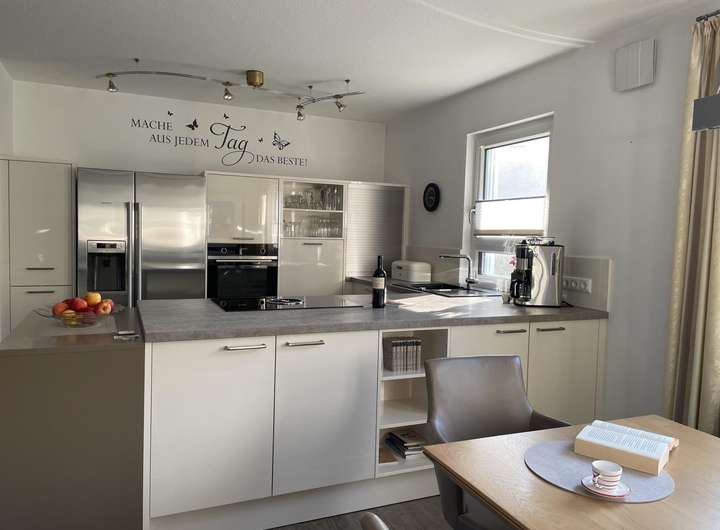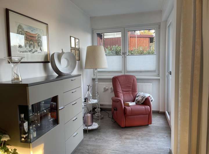 Die offene Einbauküche ist sehr hochwertig mit sämtlichen E-Großgeräten, wie z.B. Siemens Kühl-Gefrierschrank mit Ice-Funktion, Ceran-Kochfeld mit integriertem Abzug. Der Wohn- Essbereich ist sehr großzügig gehalten mit einer hellen Leseecke zum Garten. Die Wohn- und Schlafräume haben Vinylboden in Holzoptik.