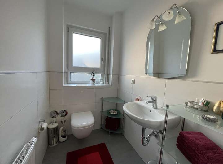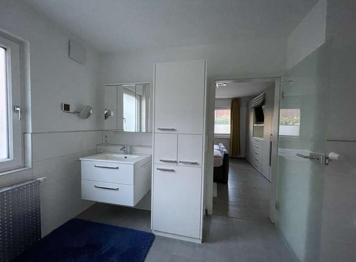 Das Bad ist in weiß-anthrazit modern gefliest, mit eingebauter geräumiger Sauna, großer bodentiefer Dusche, Einbaubadmöbel und eine Toilette mit Bidetfunktion.