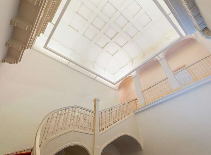 Das eindrucksvolle Treppenhaus führt auf eine Galerieebene im Obergeschoss und unterstreicht den repräsentativen Charakter dieser Einheit – prädestiniert für stilvolles Wohnen, kreative Büronutzung oder anspruchsvolle Präsentationsflächen mit bester Sichtbarkeit.