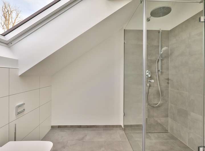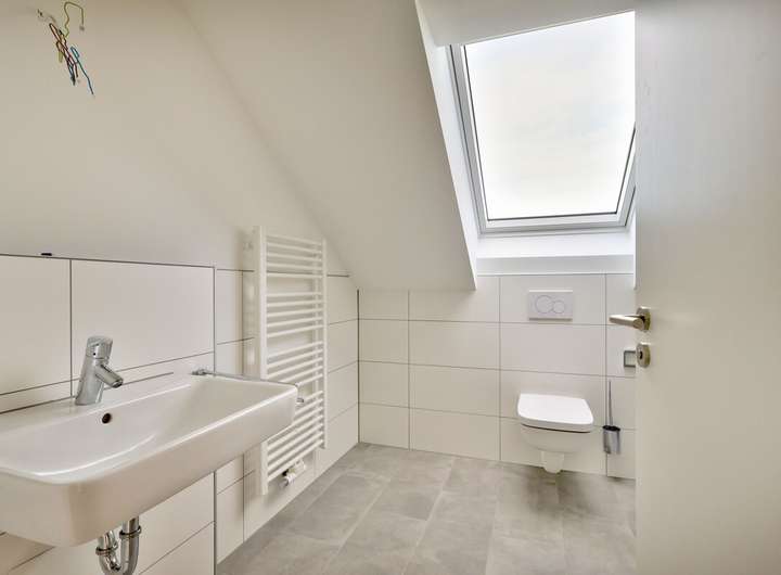 Der helle, freundliche Eingangsbereich bietet ausreichend Platz für eine Garderobe und führt direkt in das stilvolle Tageslichtbad. Dieses überzeugt mit einer bodengleichen Dusche, hochwertigen Sanitärelementen und einem großen Dachflächenfenster, das den Raum mit viel natürlichem Licht erfüllt.