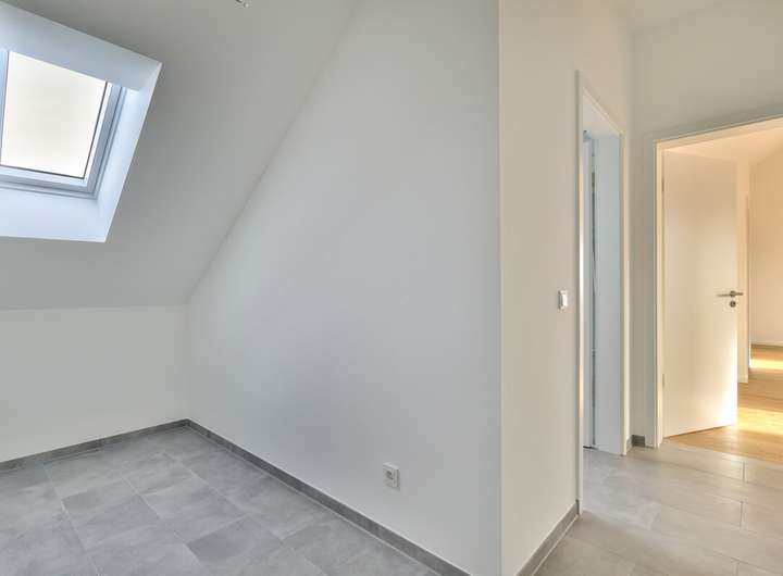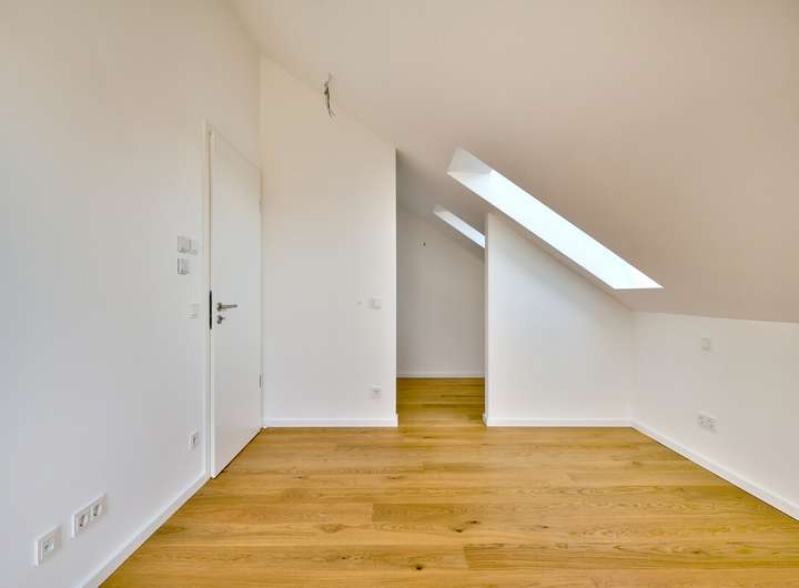 Das Schlafzimmer verfügt über eine angenehme Dachschräge und wirkt dadurch besonders gemütlich. Ein kleiner, offener Bereich unter der Schräge eignet sich ideal als Ankleide oder zusätzliche Abstellfläche.