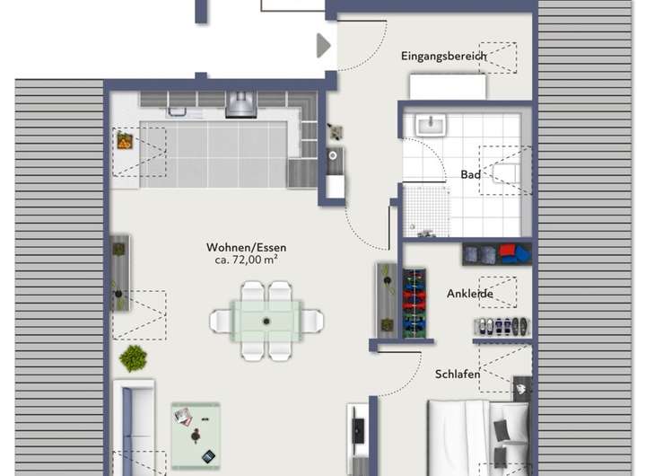 - Landhausdielen Eiche-Parkett im Wohn- und Schlafraum, Fliesen im Eingangs- und Küchenbereich und im Bad