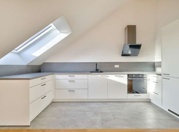 Im weiteren Verlauf öffnet sich das Highlight der Wohnung: der Wohn-, Ess- und Kochbereich. Sichtbare Holzbalken, Dachflächenfenster und bodentiefe Fensterelemente schaffen eine warme, einladende Atmosphäre. Die moderne Einbauküche fügt sich perfekt in das Gesamtbild ein und macht diesen Raum zum idealen Mittelpunkt des täglichen Lebens. Von hier aus gelangen Sie auch auf den Balkon.