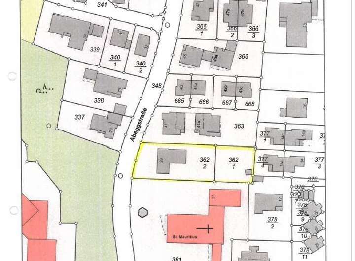 Oberhalb der St. Mauritiuskirche befindet sich das richtig große Grundstück mit 1.504 m². Der hintere Teil des Grundstücks bleibt gemäß Bebauungsplan als Gartenland erhalten, im vorderen Teil können zwei Gebäude mit entweder sechs Eigentumswohnungen oder vier Doppelhaushälften errichtet werden.