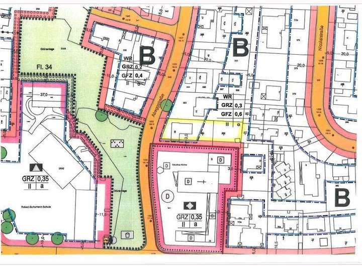 Festsetzungen des Bebauungsplans: GRZ 02, GFZ 06, 2 Vollgeschosse plus Staffelgeschoss, offene Bauweise.