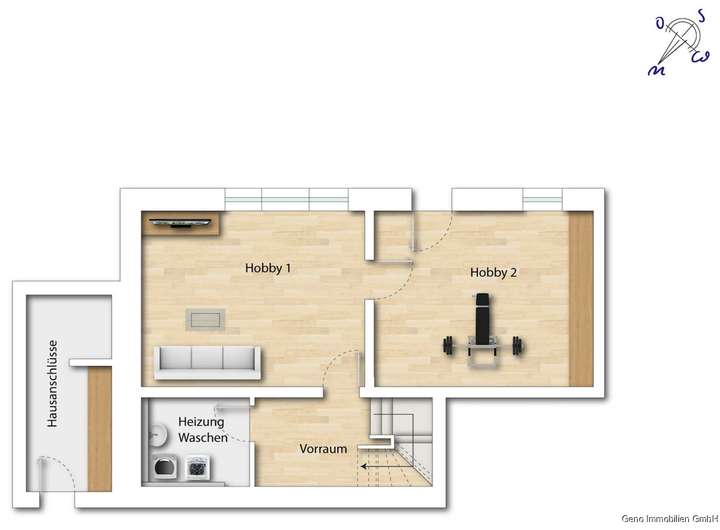 Das Gartengeschoss bietet die Besonderheit eines separaten weiteren Zugangs sowie eines zusätzlichen Hobbyraums von ca. 20,54 qm.
