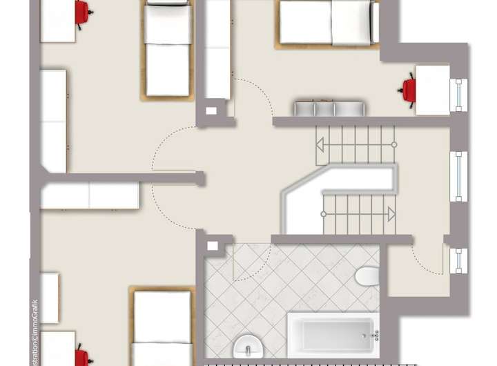 Das Obergeschoss und Dachgeschoss bilden gemeinsam die zweite Wohneinheit mit insgesamt ca. 93 m² Wohnfläche. Diese großzügige Wohnung verfügt über 5 Zimmer, Küche, Diele, Bad, Abstellraum sowie einen Kelleranteil. Die Räume sind hell, gut geschnitten und bieten vielfältige Nutzungsmöglichkeiten – ideal für Familien oder Paare mit Platzbedarf.