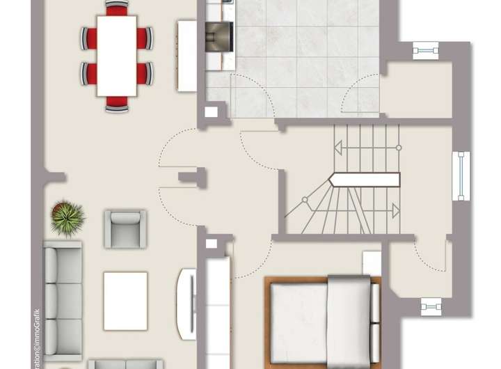 Im Erdgeschoss befindet sich eine gemütliche, derzeit vermietete 2-Zimmer-Wohnung mit ca. 52 m² Wohnfläche. Sie umfasst ein Wohnzimmer, ein Schlafzimmer, eine Küche, Diele, Bad sowie einen Abstellraum und einen Kelleranteil. Die Wohnung ist in einem gepflegten Zustand und erwirtschaftet stabile Mieteinnahmen.