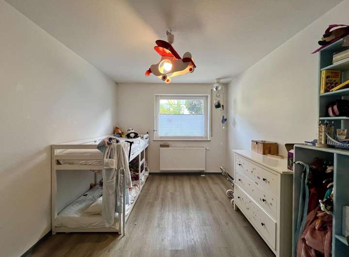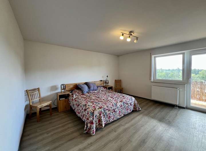 Das Erdgeschoss umfasst einen zentralen Flur, ein Büro, ein Gäste-WC, ein helles Wohnzimmer mit Essbereich und angrenzender Einbauküche sowie einen direkten Zugang zum Balkon mit Blick ins Grüne. Außerdem befinden sich hier ein Schlafzimmer, zwei Kinderzimmer und ein Tageslichtbad mit Wanne und Dusche. Von dieser Ebene aus ist auch die große Garage mit Platz für zwei PKW erreichbar.