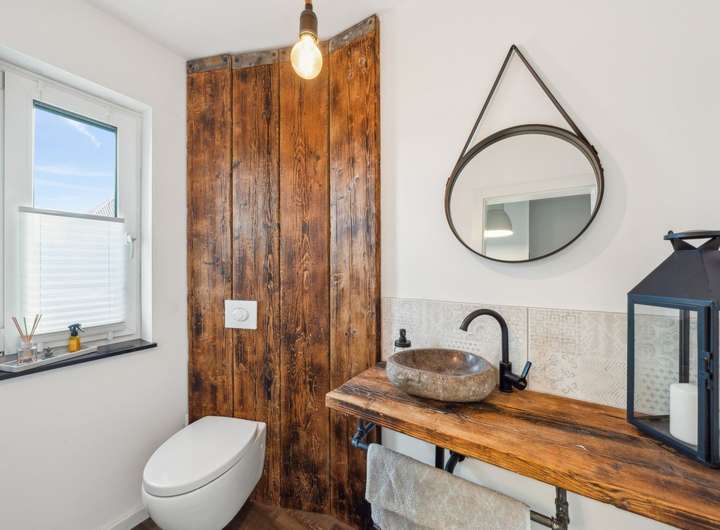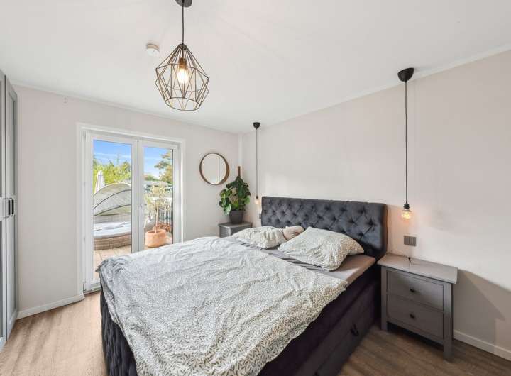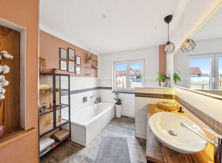 Insgesamt stehen vier Schlafzimmer zur Verfügung, die flexibel als Kinder-, Gäste- oder Arbeitszimmer genutzt werden können. Ergänzt wird das Raumangebot durch ein stilvolles Badezimmer mit Dusche und Badewanne, ein separates Gäste-WC, einen Hauswirtschaftsraum sowie einen praktischen Abstellraum.
