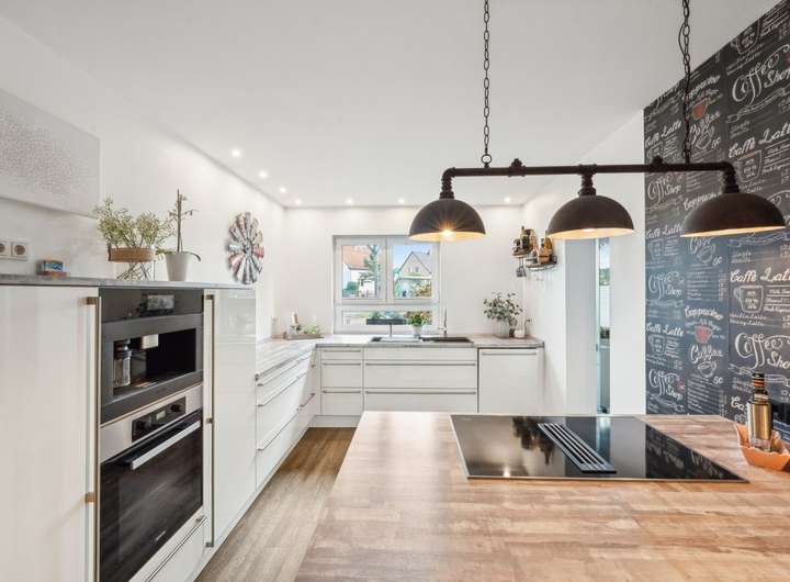 Der großzügige Wohnbereich mit Kamin bildet das Herzstück des Hauses und lädt zu entspannten Stunden im Kreise der Familie ein. Die offene, moderne Küche ist funktional gestaltet und fügt sich harmonisch in das Wohnkonzept ein – ideal für gemeinsame Kochmomente.