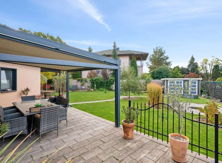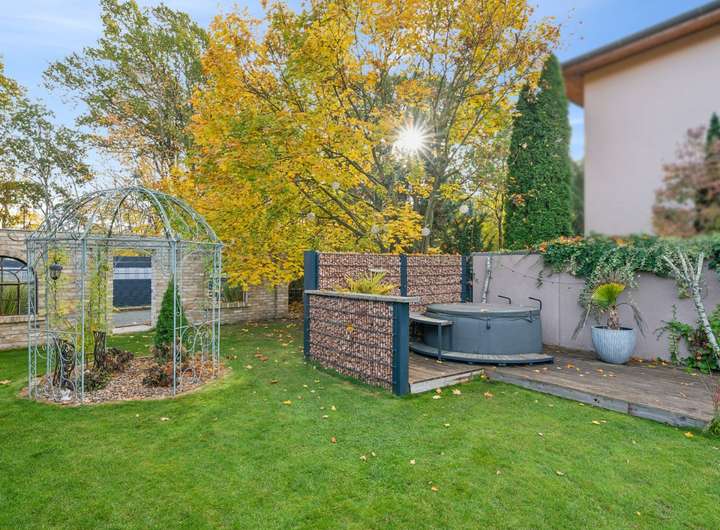 Der Außenbereich begeistert mit einem großen, liebevoll angelegten Garten, der Erholung pur verspricht. Die überdachte Terrasse mit integrierter Sommerküche lädt zu geselligen Abenden im Freien ein – egal bei welchem Wetter. Ein besonderes Highlight ist der Whirlpool, der für Entspannung und Urlaubsfeeling im eigenen Zuhause sorgt.