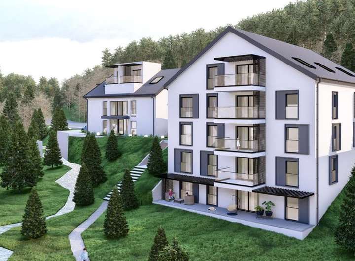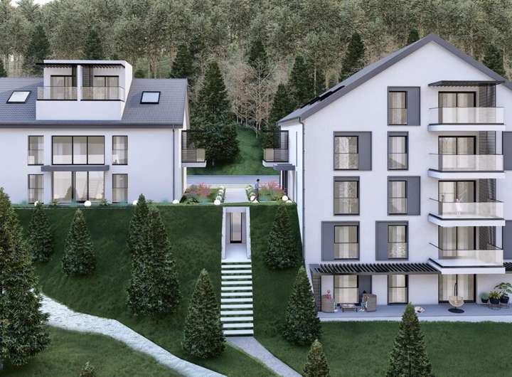 Wohngebäude 1 umfasst 11 Wohneinheiten und verfügt über zwei Untergeschosse. In diesen Ebenen befinden sich zwei übereinanderliegende Wohnungen mit Ausrichtung zum großzügigen Gartenbereich. Die übrigen Flächen der Untergeschosse dienen als Keller-, Technikräume sowie als Tiefgarage.