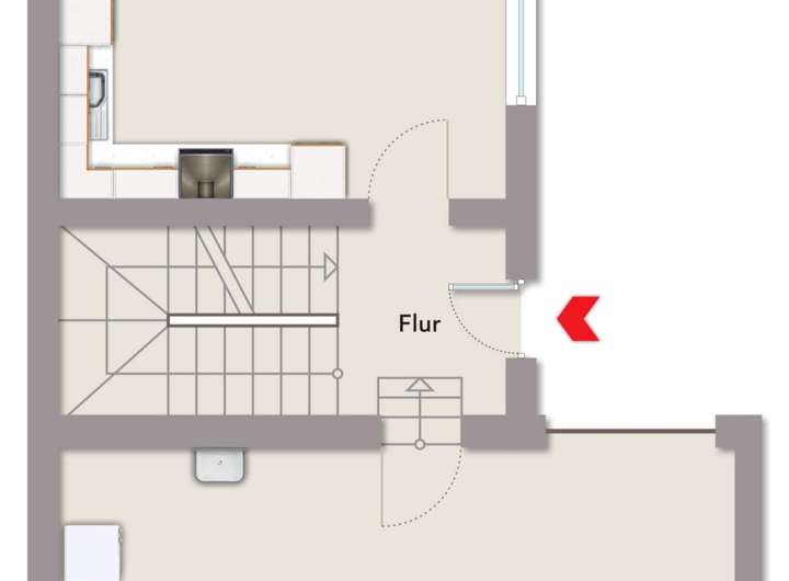 Bereits im Erdgeschoss besticht die Immobilie durch eine gepflegte Wohnküche mit offenem Durchgang zum Wohnbereich, freilegenden Holzbalken, vertäfelten Türen und einem hochwertigen Echtholz Parkettboden