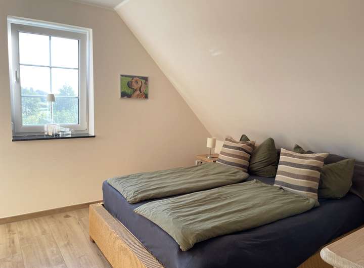 Im rechten, etwas schmaleren Teil, mittig in die Dachgaube mit den bodentiefen Fenstern gerückt, wurde das Bett genauso gestellt, dass man den herrlichen Blick aus dem Fenster genießen kann. Hier möchte man gar nicht mehr aufstehen!