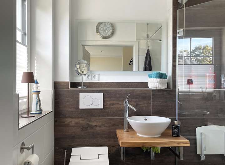 Direkt vom Flur aus nach links betritt man das tadellose Gäste-WC oder besser gesagt Gäste-Bad, denn es ist mit einer modernen, ebenerdigen Dusche ausgestattet, die über die gesamte Länge des Raumes verläuft.