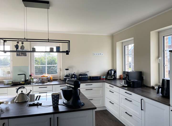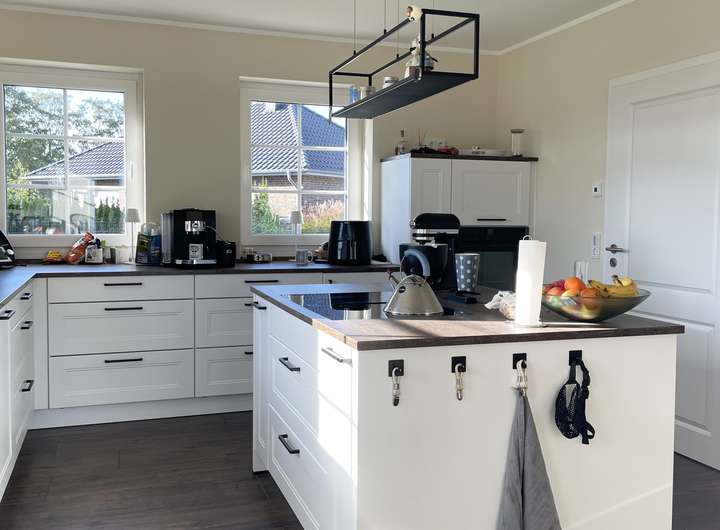Die Einbauküche verläuft im rechten Winkel mit Unterschränken und zwei ¾-hohen Schrankelementen über die gesamte Süd- und Westwand. Ein große Kochinsel wurde in der Mitte des Raumes platziert.