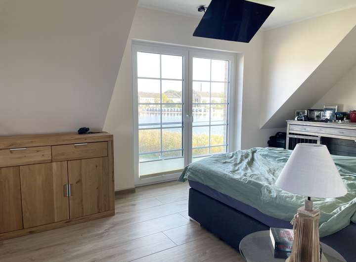 Das Haus ist von seiner Platzierung auf dem Grundstück zum See hin ausgerichtet und so bietet auch das große Elternschlafzimmer einen fantastischen Ausblick.