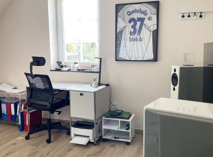 Für bestes Arbeitslicht in diesem Raum sorgen zwei Fenster an der Südwand sowie zwei weitere Fenster an der Süd-Ost-Wand des Raumes mit Blick zum See. Die Tür zur Diele befindet sich an der Nordwand des Raumes. Eine weitere Tür an der Ostwand führt in das Wohn-Ess-Zimmer.