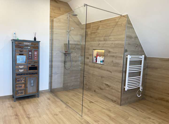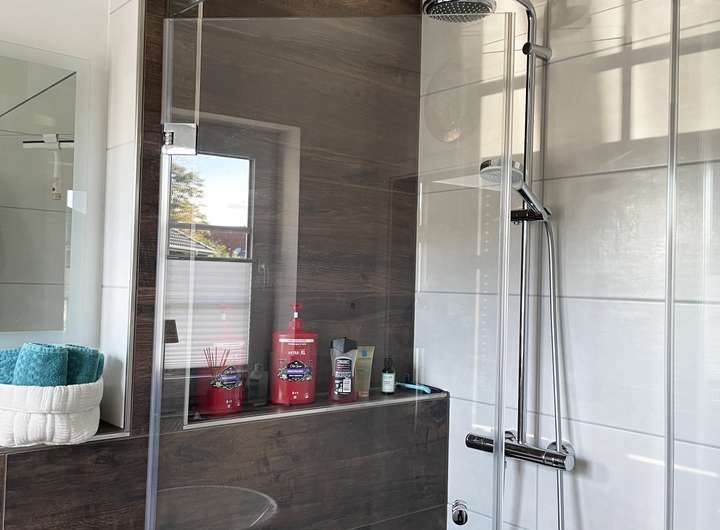 Der Duschbereich ist als große, moderne Walk-In-Dusche ohne Tür und mit nahtlosem Übergang zum Badezimmer konzipiert und wurde im süd-westlichen Teil des Raumes eingerichtet.