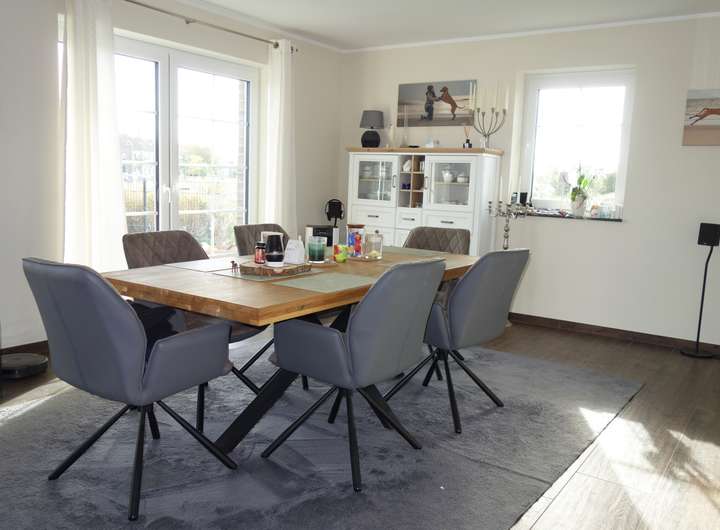 Der große Raum gliedert sich in zwei Bereiche. Im südöstlichen Teil des Raumes, nahe der Tür zur Küche haben sich die Eigentümer einen großzügigen Essbereich angelegt.