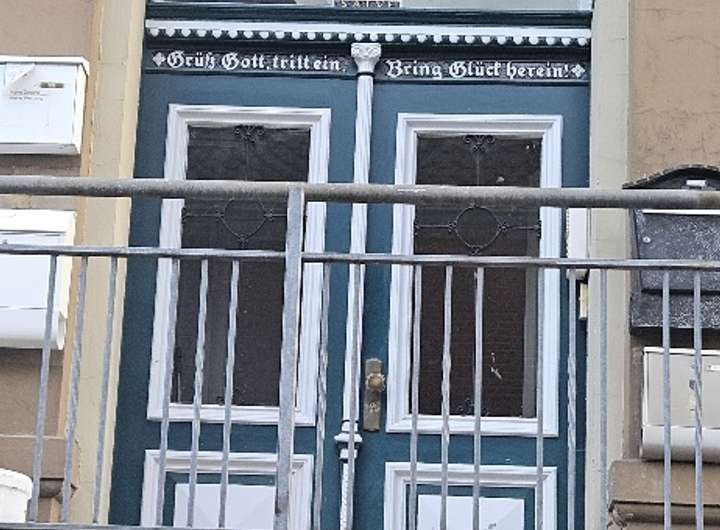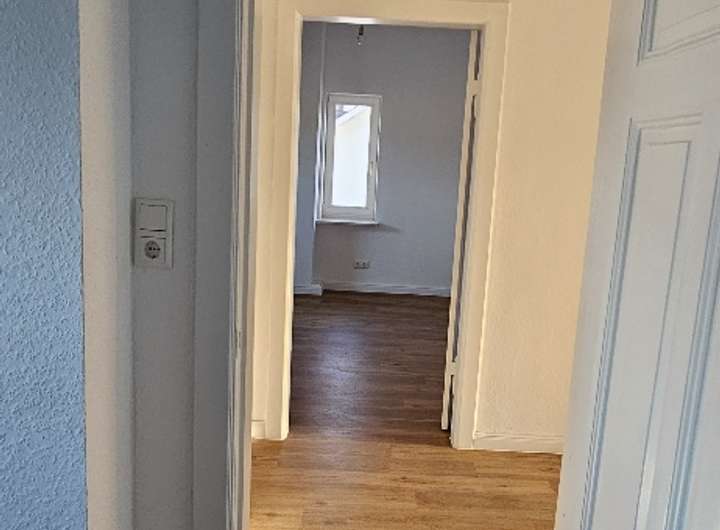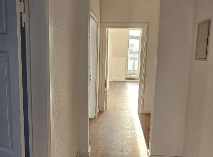 Vom Treppenhaus und die Wohnungseingangstür gelangt man in den in den Flur der Wohnung. Gleich links befindet sich ein weiterer Vorflur mit Platz für Garderobe, gegenüber das Gäste WC. Hinter dem Vorflur befindet sich ein Schlaf-/Arbeitszimmer. Der Flur ist durch die ehemalige Wohungstür von der ursprünglichen Wohnung unterteilt. Hinter dieser Trenntür führt der Wohnungsflur dann weiter zur Wohnküche und der Zugangstür zum Wohnzimmer. Dem Wohnzimmer vorgelagert ist die zur Wohnung gehörende Südterrasse mit Fernblick auf den alten Burggraben und den darum herum geführten Stadtpark.