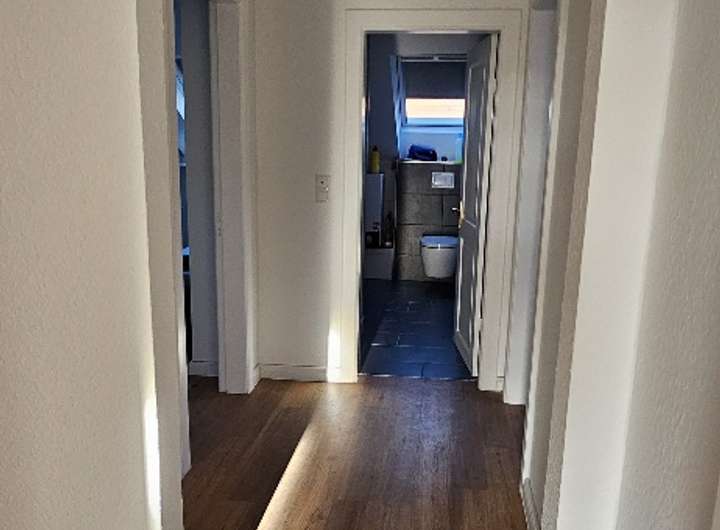 Die Dachgeschosswohnung verfügt über einen internen, räumlich durch eine Zwischentür im Flur von der Hauptwohnung getrennten Besuchs-/Homeofficebereich mit eigenem Gäste-WC im vorderen Teil der Wohnung.